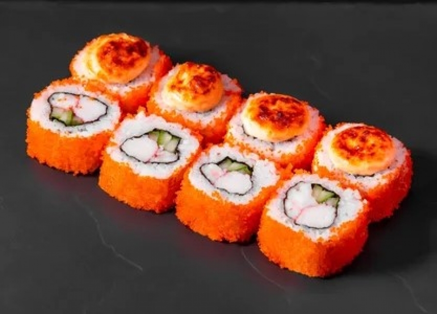 креветка, огурец, икра, шапочка фирменный соус.
